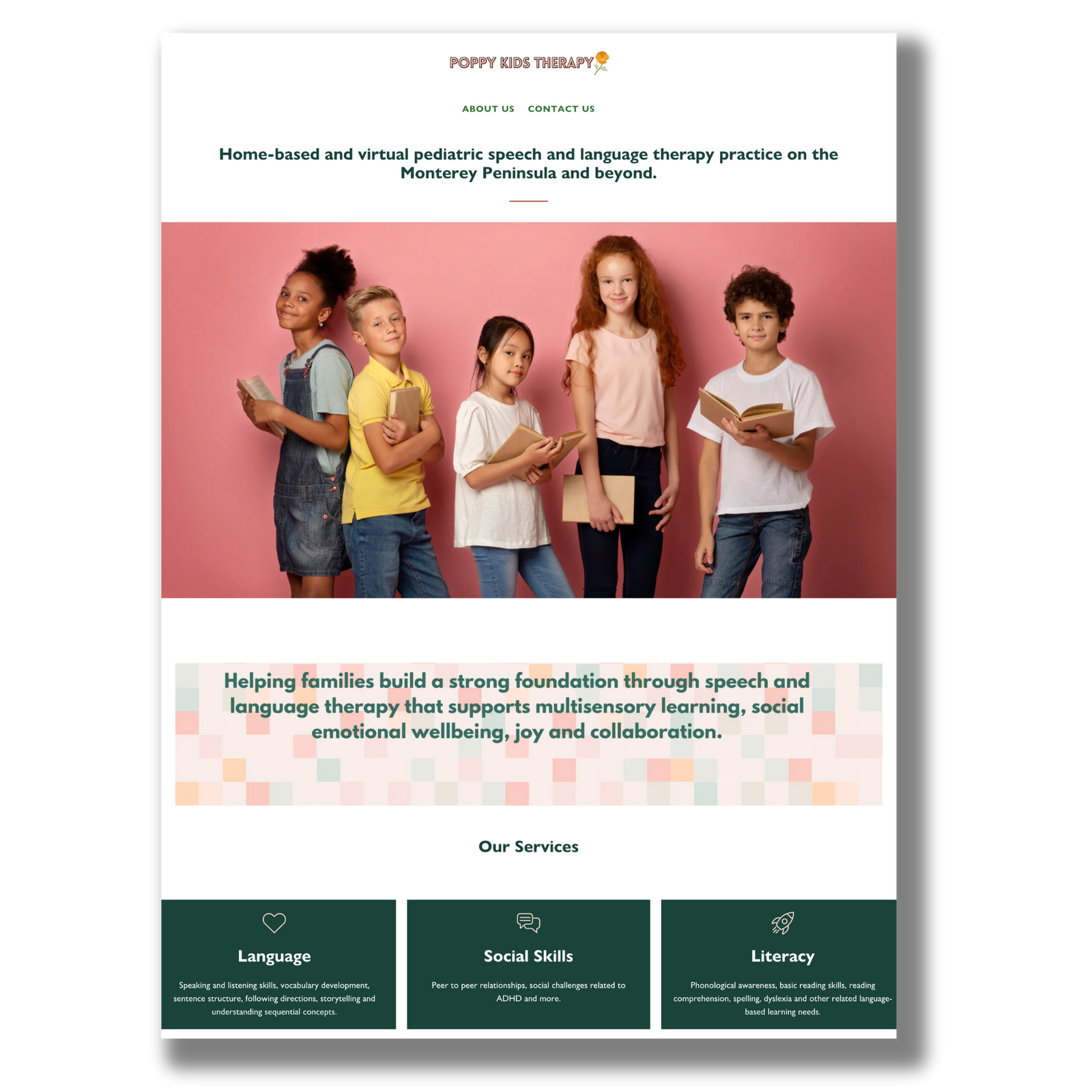 Poppy Kids Therapy needed a site designed to showcase their pediatric therapy services, and link to their online shop. We designed a site to highlight their services, wrote warm and inviting copy, and worked with their team to develop brand colors and message.